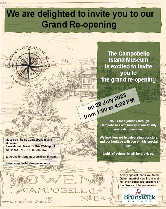 The Campobello Island Museum is excited to invite you to the grand re-opening on July 29, 2023 from 1:00 to 4:00 pm. Light refreshments will be provided.